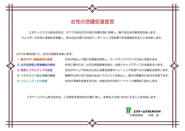 「女性の活躍促進宣言」を念頭に「あいち女性輝きカンパニー」の認証取得の申請を行っています。