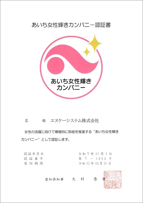 「女性の活躍促進宣言」を念頭に、女性の活躍に積極的に取り組んでいる企業として「あいち女性輝きカンパニー」の認証を取得しております。
